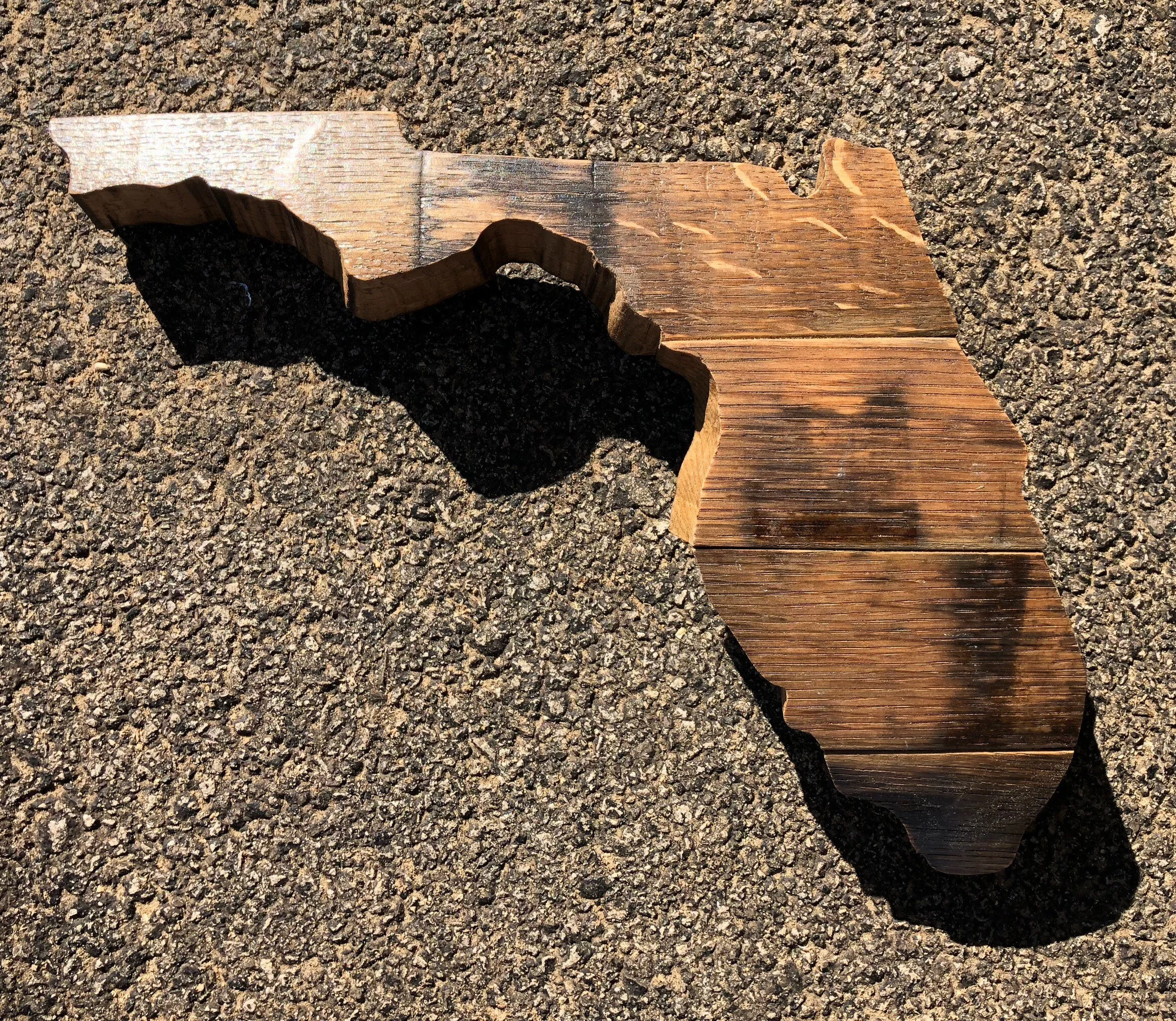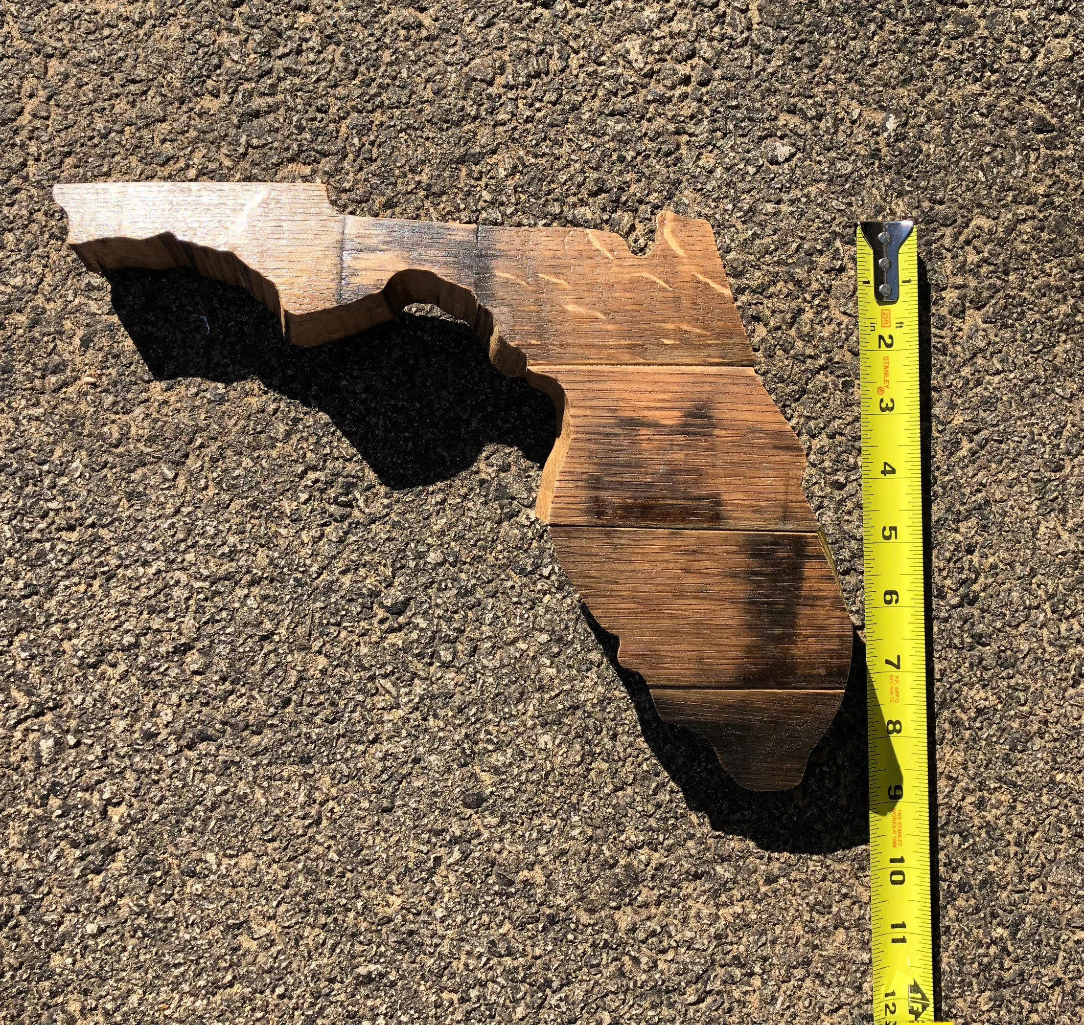 The back of the state shape still shows the black charring from the beginning of the barrel making process.